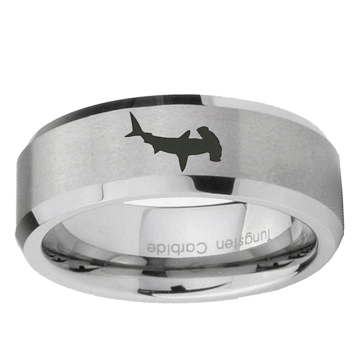 6, 8mm Hammerhead Shark Beveled Edge Brushed Grey Tungsten Mens Ring