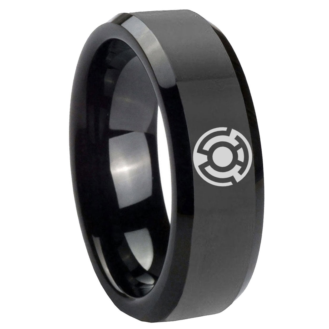 Intruding 5, 8mm Yellow Lantern Beveled Edge Polish Black Mens Comfort Wedding Band . Offer in both 5mm and 8mm band width polished black plated finished from size 4 to 14