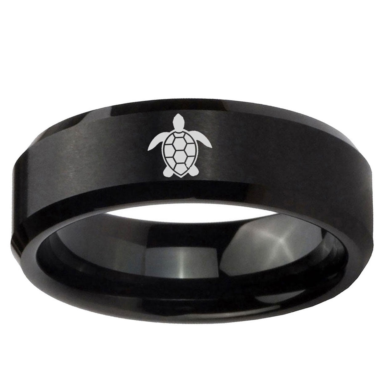 Intruding 5, 8mm Sea Turtle Beveled Edge Brushed Black Durable Wedding Bands For Her . Offer in both 5mm and 8mm band width brushed black plated finished from size 4 to 14