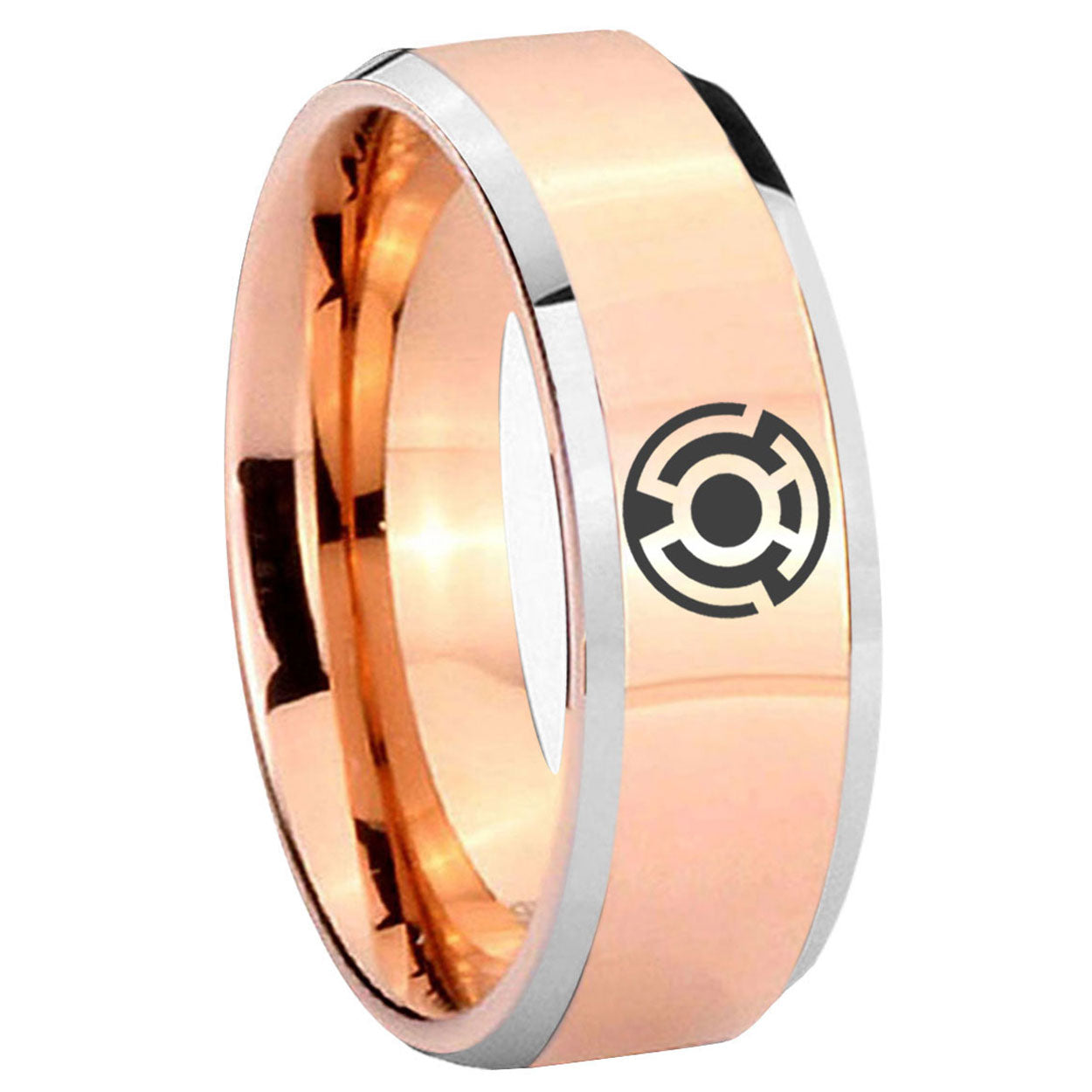 Intruding 5, 8mm Yellow Lantern Beveled Edge Rose Gold Personalized Tungsten Rings . Offer in both 5mm and 8mm band width rose gold two tone finished from size 4 to 14