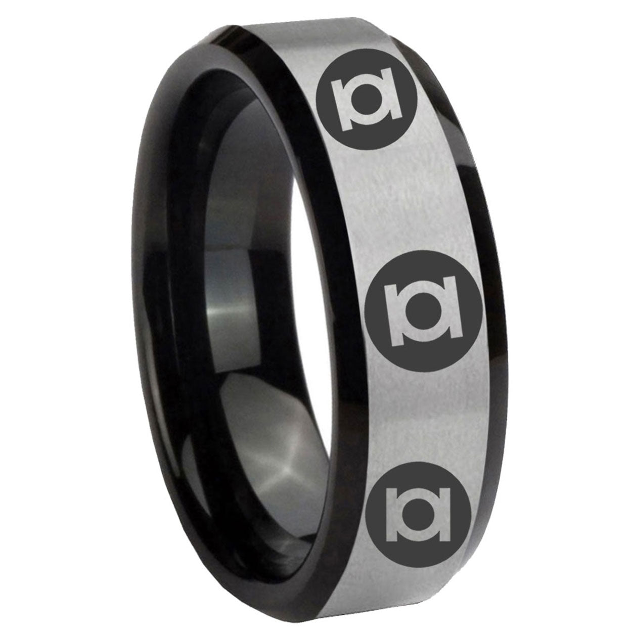 Intruding 5, 8mm Multiple Green Lantern Beveled Edge Black Silver Tungsten Carbide Mens Rings . Offer in both 5mm and 8mm band width brush black 2 tone finished from size 4 to 14