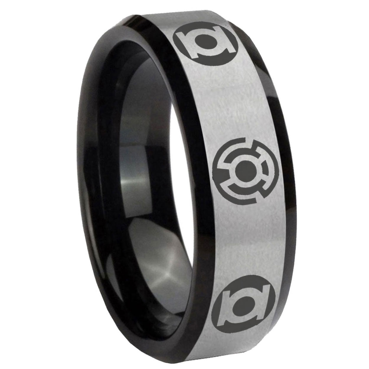 Intruding 5, 8mm Blue Green Lantern Beveled Edge Black Silver Engraved Rings For Him . Offer in both 5mm and 8mm band width brush black 2 tone finished from size 4 to 14