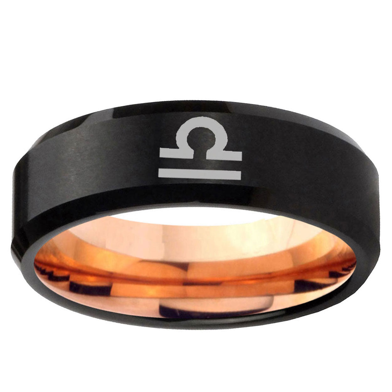 Intruding 5, 8mm Libra Horoscope Beveled Edge Rose Gold and Black Tungsten Men's Wedding Ring . Offer in both 5mm and 8mm band width Rose Gold and Black finished from Size 4 to 14