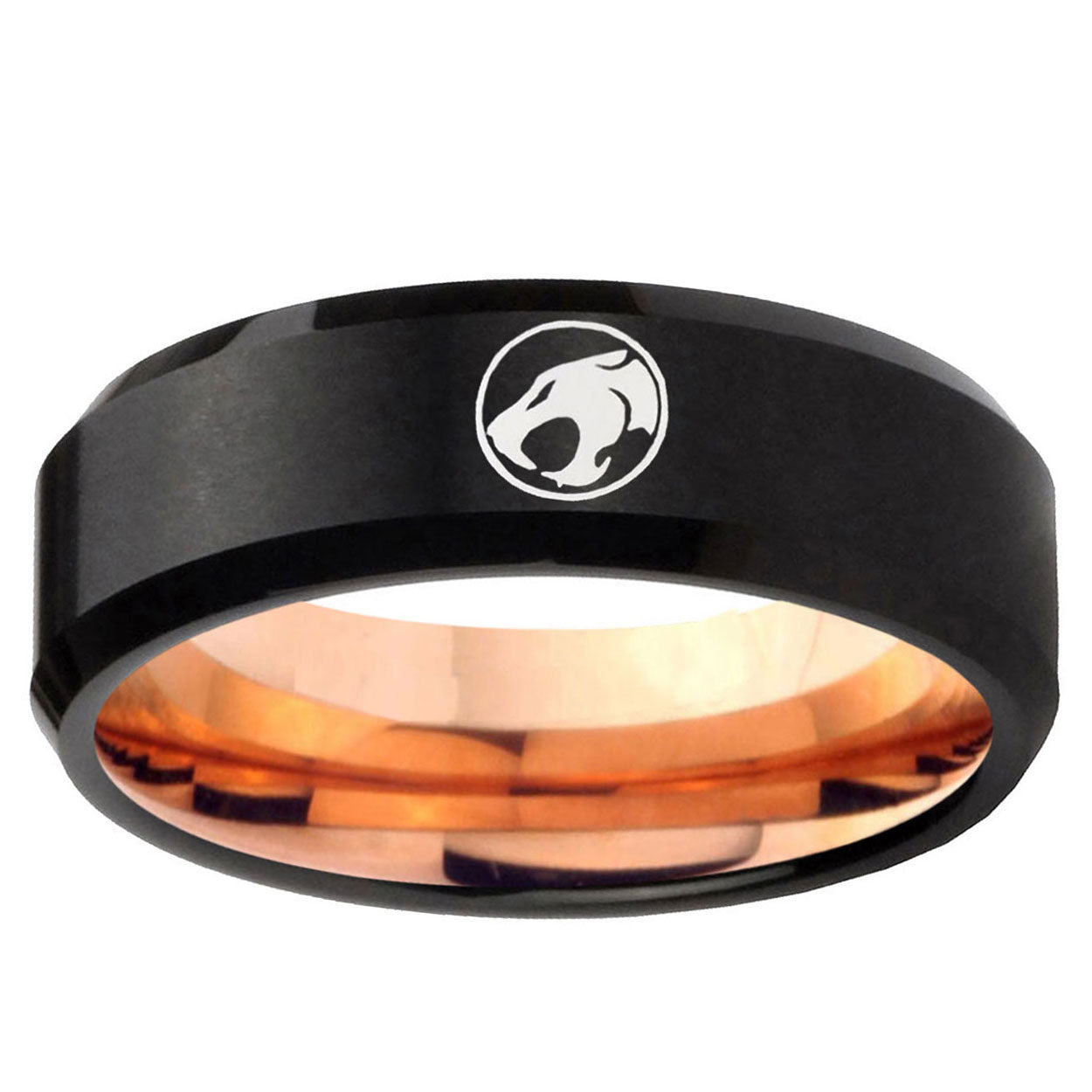 Intruding 5, 8mm Thundercat Beveled Edge Rose Gold and Black Tungsten Men's Engagement Band . Offer in both 5mm and 8mm band width Rose Gold and Black finished from Size 4 to 14