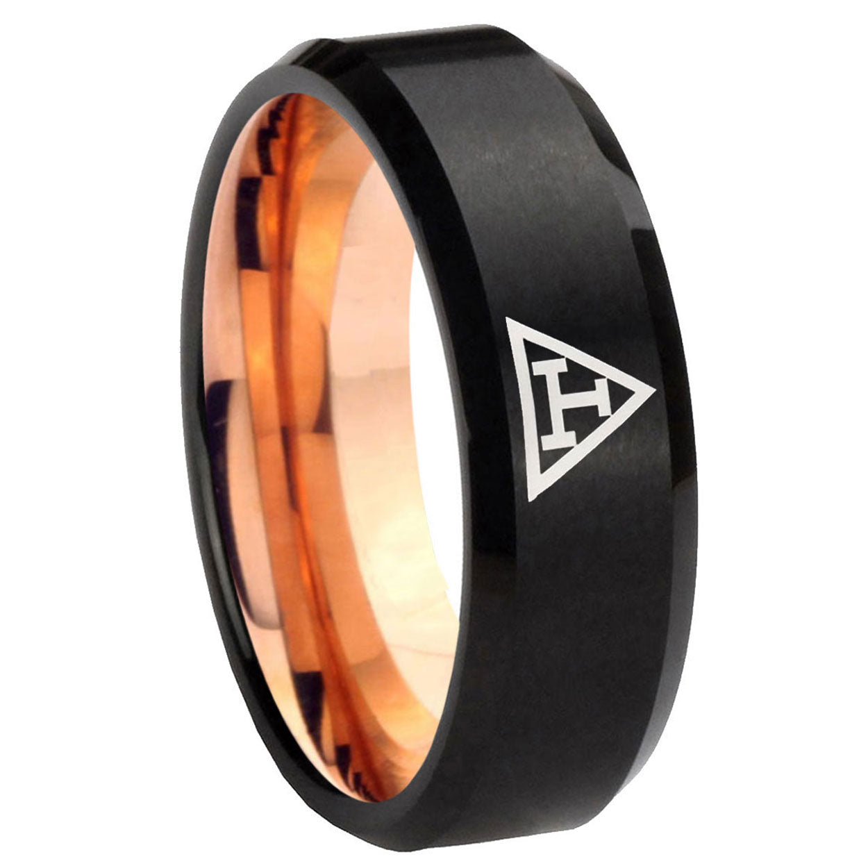 Intruding 5, 8mm Masonic Triple Beveled Edge Rose Gold and Black Tungsten Men's Band Ring . Offer in both 5mm and 8mm band width Rose Gold and Black finished from Size 4 to 14