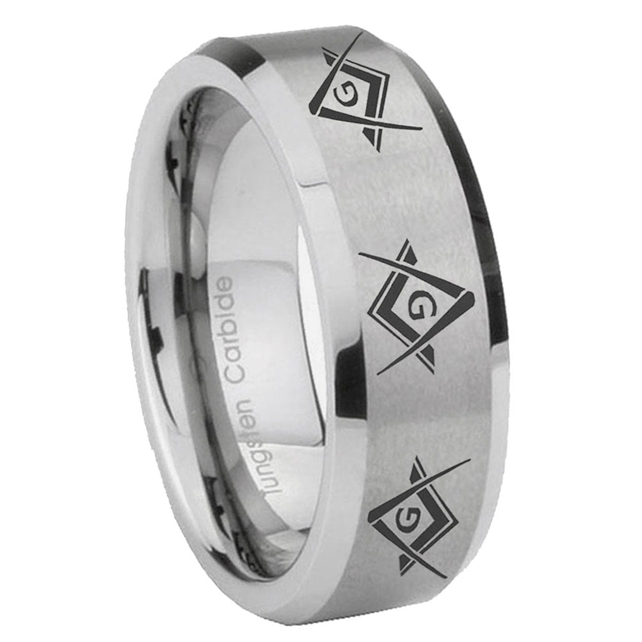 Style the 10mm Master Mason Masonic Beveled Edges Silver Tungsten Men's Band Ring. This silver tungsten ring with Master Mason Masonic design is perfect for men.