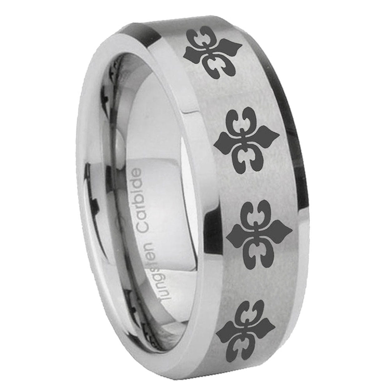 Propose with the 10mm Multiple Fleur-De-Lis Beveled Edges Silver Tungsten Mens Engagement Band. This silver tungsten ring with Multiple Fleur-De-Lis design is ideal for engagements.