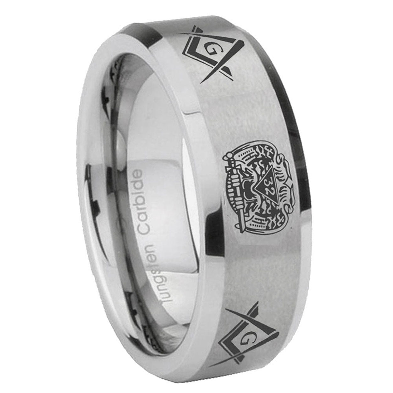 Style the 10mm Masonic 32 Design Beveled Edges Matte Grey Tungsten Carbide Mens Ring. This silver tungsten ring with Masonic 32 Design is perfect for men.