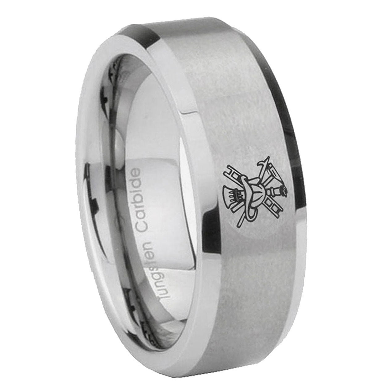 Propose with the 10mm Fireman Beveled Edges Matte Grey Tungsten Carbide Mens Engagement Ring. This silver tungsten ring with Fireman design is ideal for engagements.