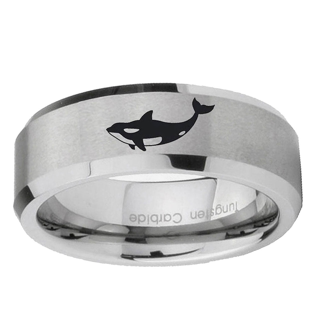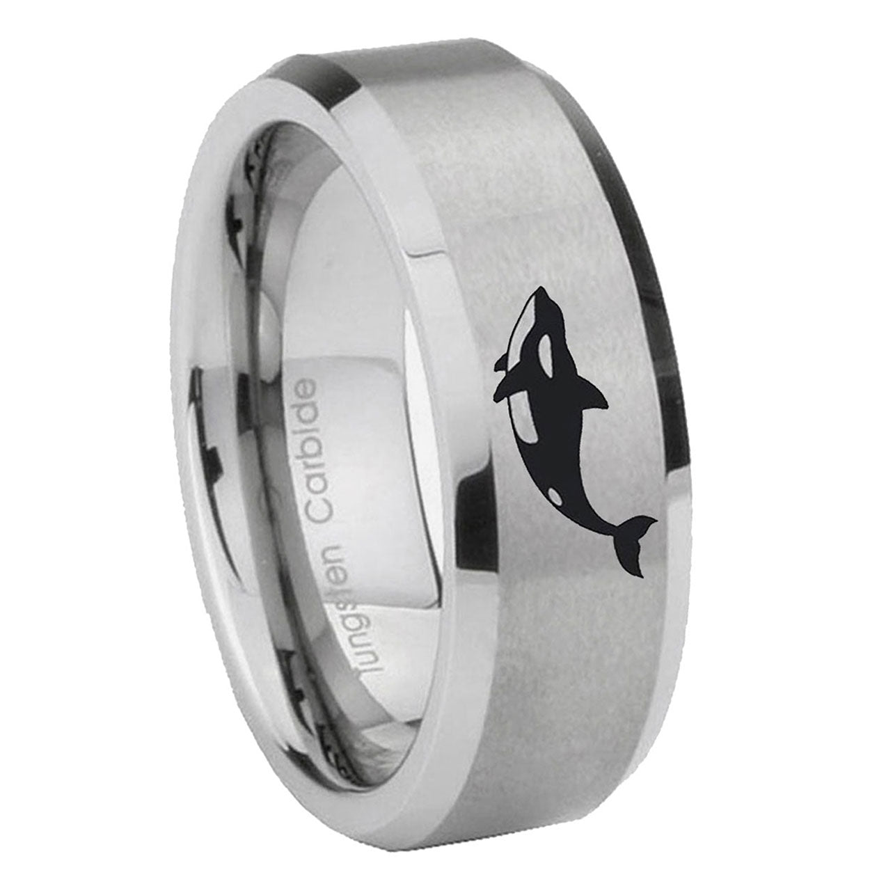 Personalize the 10mm Keller Whale Beveled Edges Matte Grey Tungsten Carbide Mens Ring Engraved. This silver tungsten ring with Keller Whale design is perfect for custom engravings.