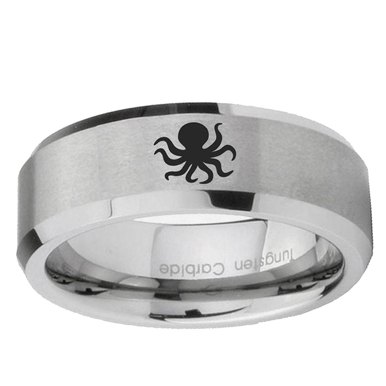 Personalize the 10mm Octopus Beveled Edges Matte Grey Tungsten Carbide Mens Ring Engraved. This silver tungsten ring with Octopus design is perfect for custom engravings.