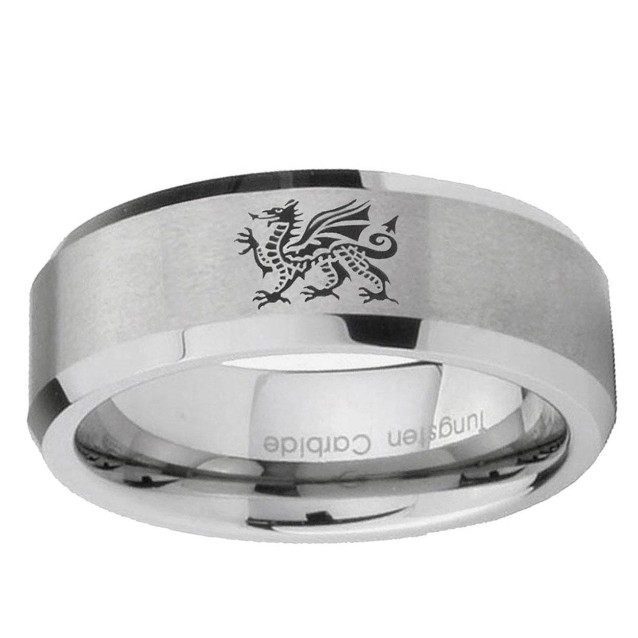 Celebrate with the 10mm Dragon Beveled Edges Matte Grey Tungsten Carbide Men's Wedding Ring. This silver tungsten ring with Dragon design is perfect for weddings.