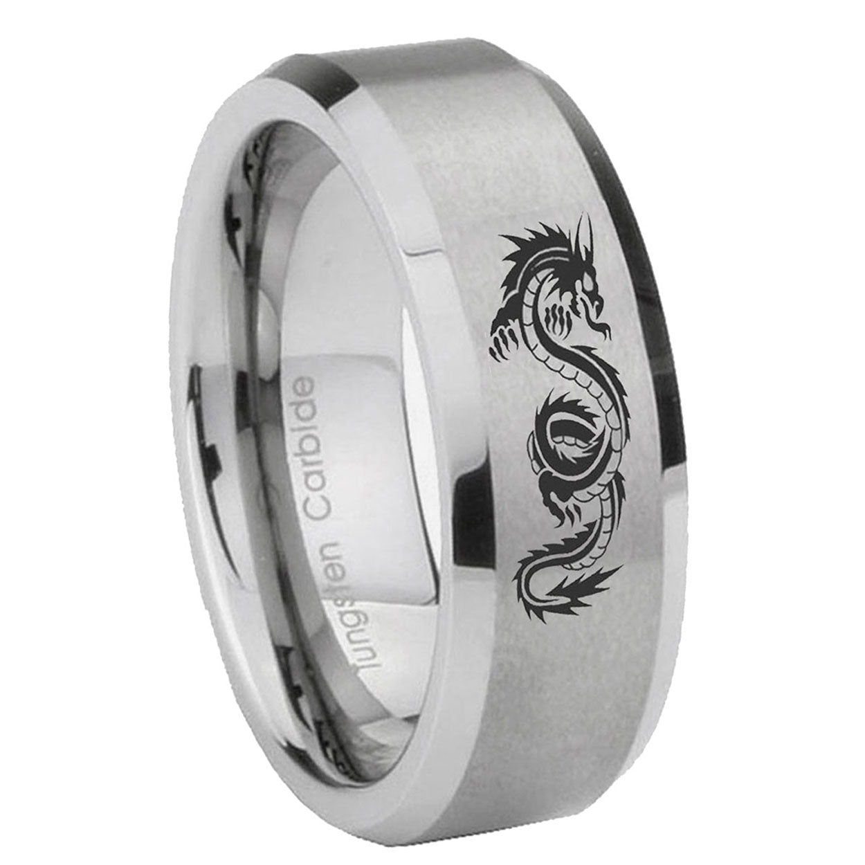 Propose with the 10mm Dragon Beveled Edges Matte Grey Tungsten Carbide Mens Engagement Band. This silver tungsten ring with Dragon design is ideal for engagements.
