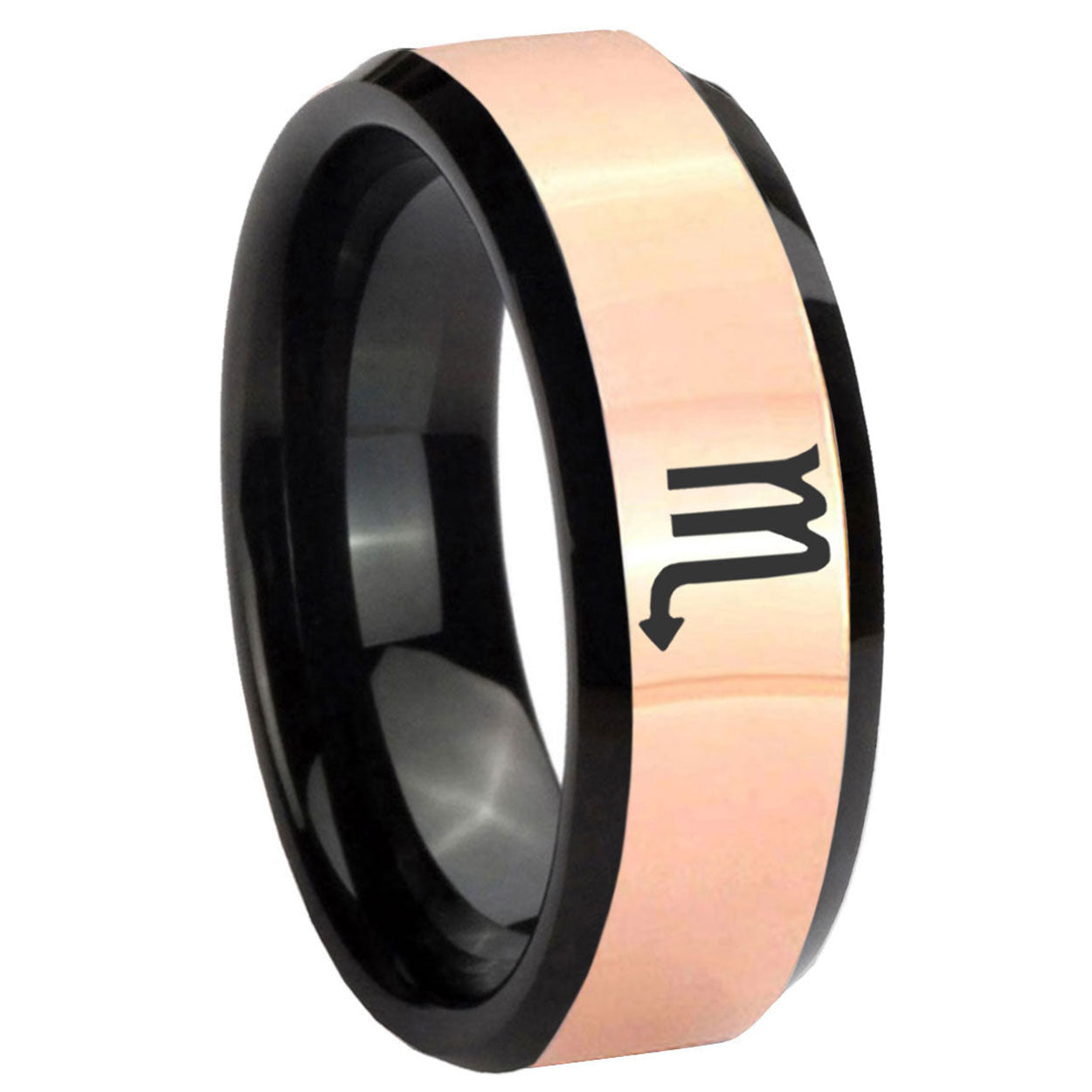 Intruding 8mm Scorpio Horoscope Rose Gold And Black Beveled Edge Tungsten Carbide Engagement Ring . Offer in men wedding band in 8mm band width rose gold black plated finished from size 7 to 14