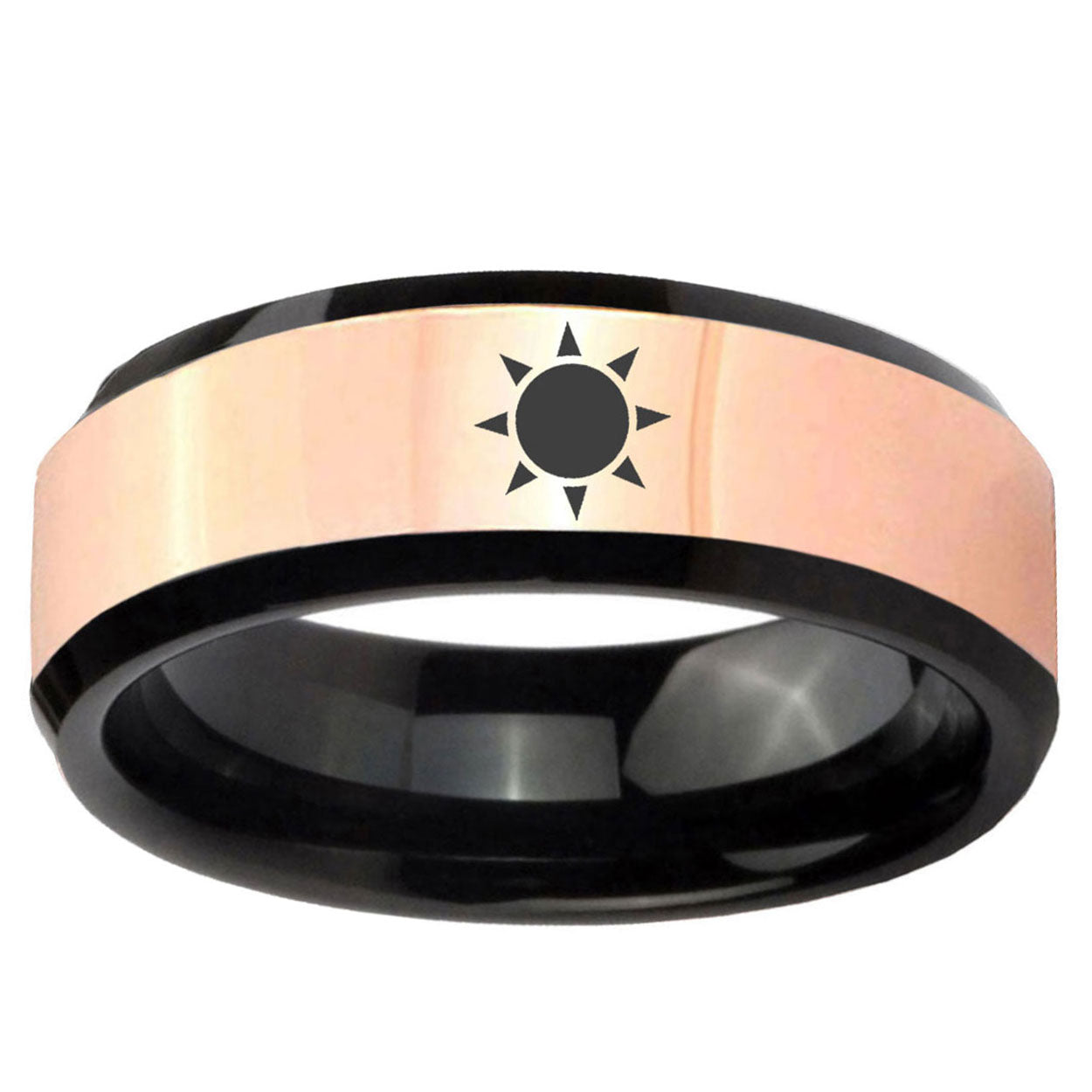 8mm Sun Design Rose Gold And Black Beveled Edge Tungsten Carbide Wedding Bands