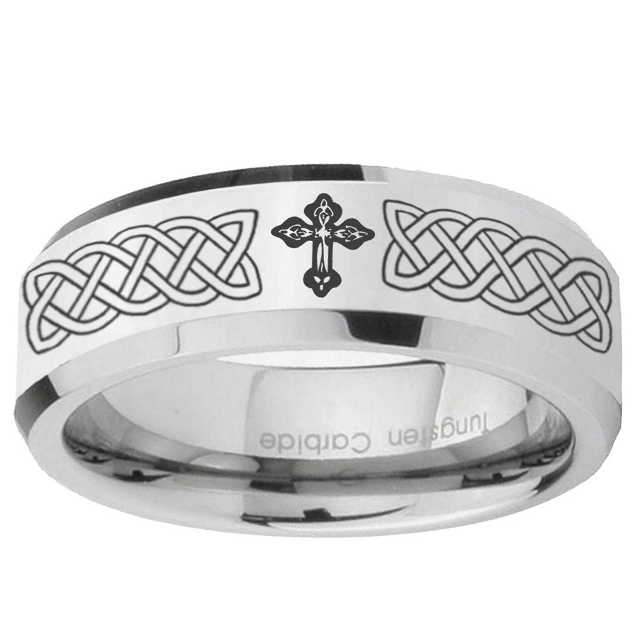 Celebrate milestones with the 10mm Celtic Cross Beveled Edges Silver Tungsten Carbide Mens Anniversary Ring. This silver tungsten ring with Celtic cross design is perfect for anniversaries.