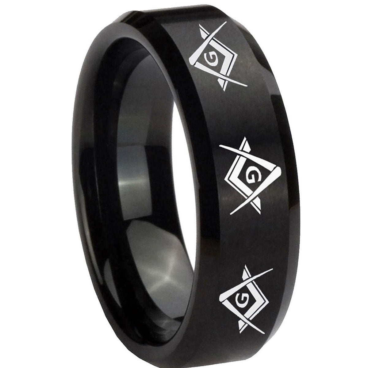 10mm Master Mason Masonic Beveled Brush Black Tungsten Men's Promise Rings