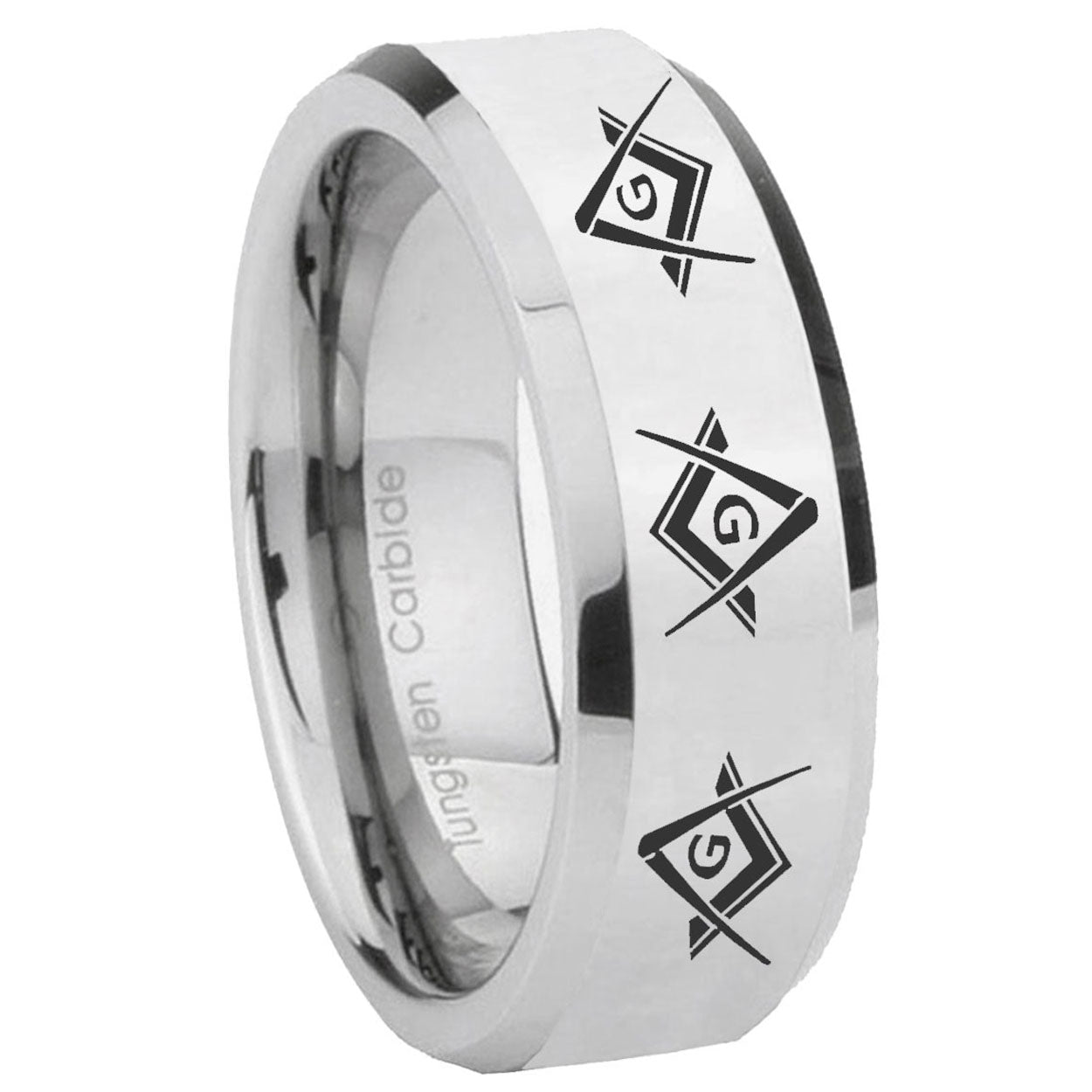 Intruding 5, 8mm Master Mason Masonic Beveled Edges Silver Tungsten Mens Ring Personalized . Offer in both 5mm and 8mm band width polished silver finished from size 4 to 14