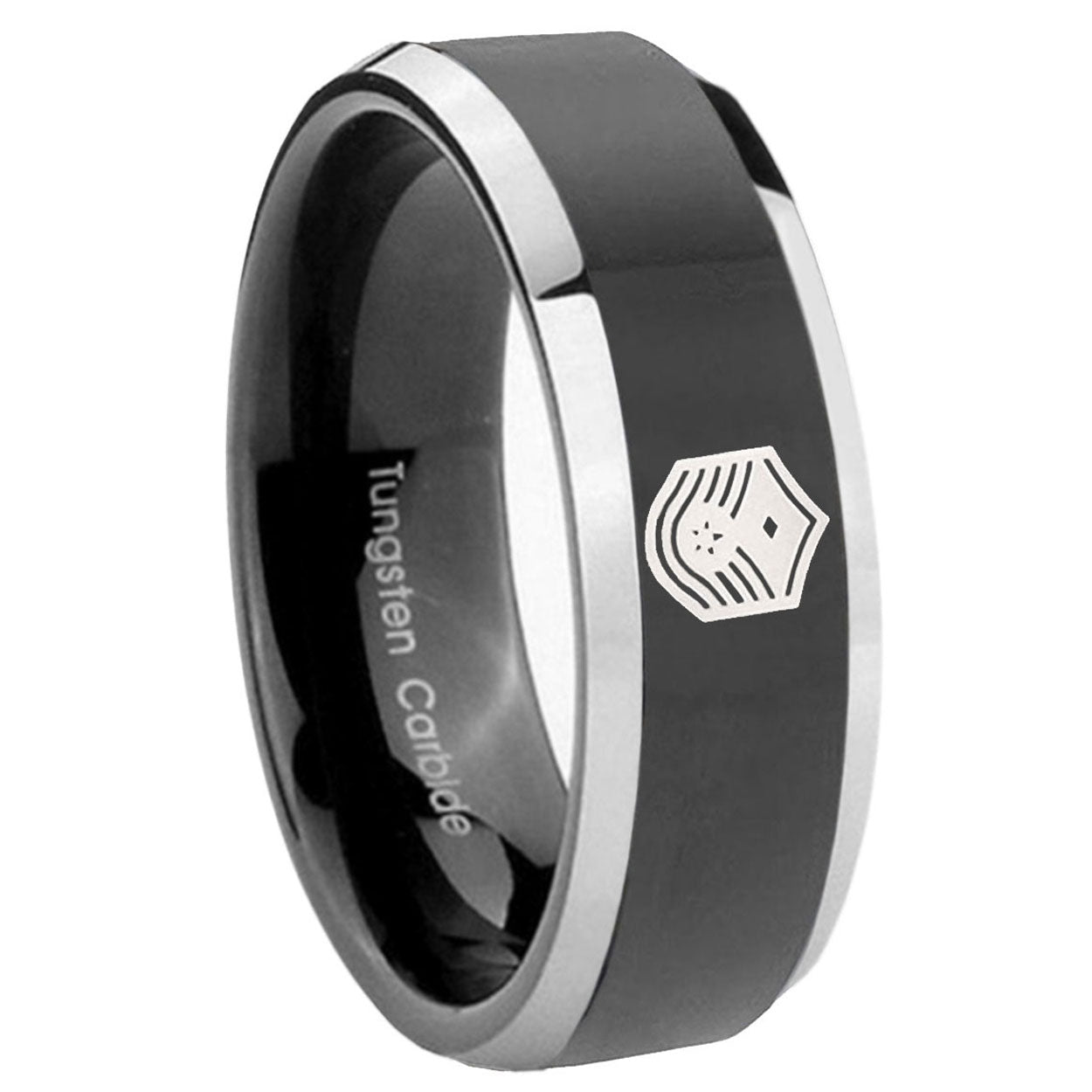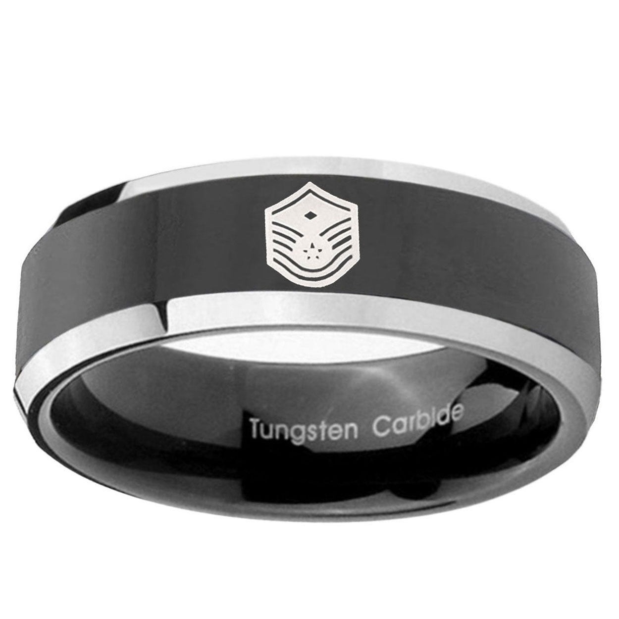 Propose with the 10mm Chief Master Sergeant Vector Beveled Glossy Black 2 Tone Tungsten Mens Ring. This glossy black and 2-tone tungsten ring with Chief Master Sergeant design is ideal for engagements.