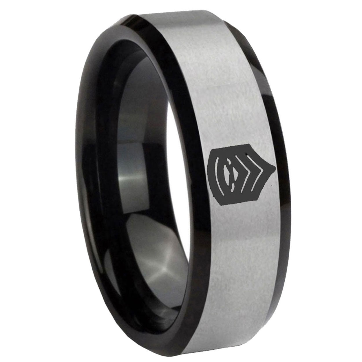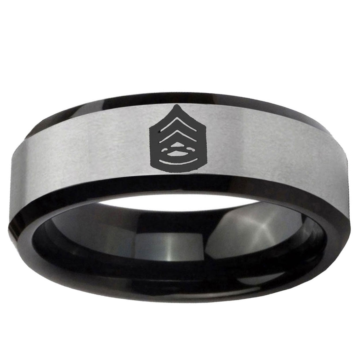 Intruding 5, 8mm Army Sergeant Major Beveled Edges Brush Black 2 Tone Tungsten Engraved Ring . Offer in both 5mm and 8mm band width brush black 2 tone finished from size 4 to 14