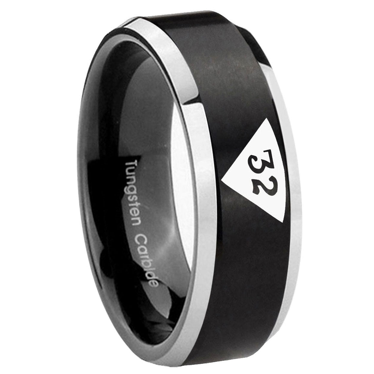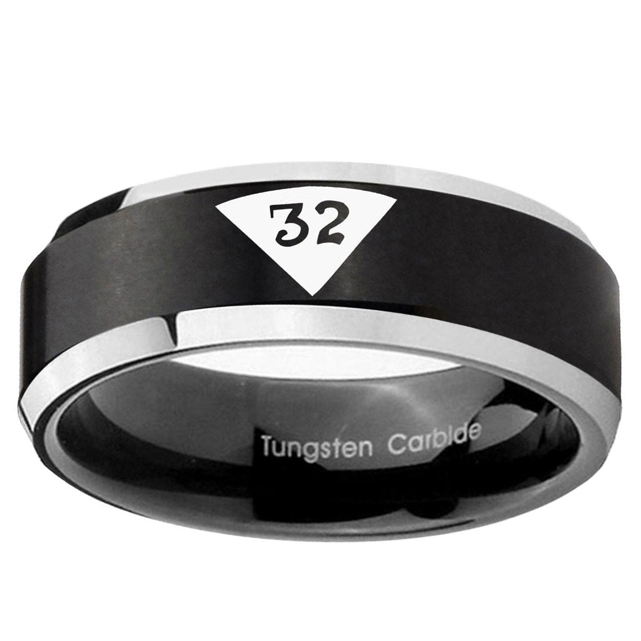 Celebrate with the 10mm Masonic 32 Triangle Design Freemason Beveled Edges Brush Black 2 Tone Tungsten Carbide Bands Ring. This brushed black and 2-tone tungsten ring with Masonic 32 Triangle Design Freemason design is perfect for weddings.