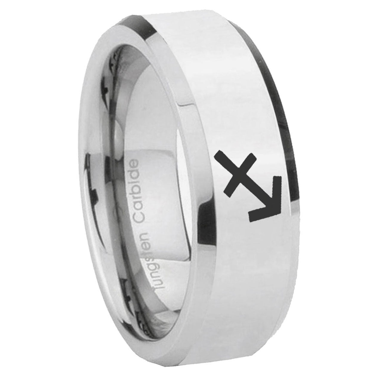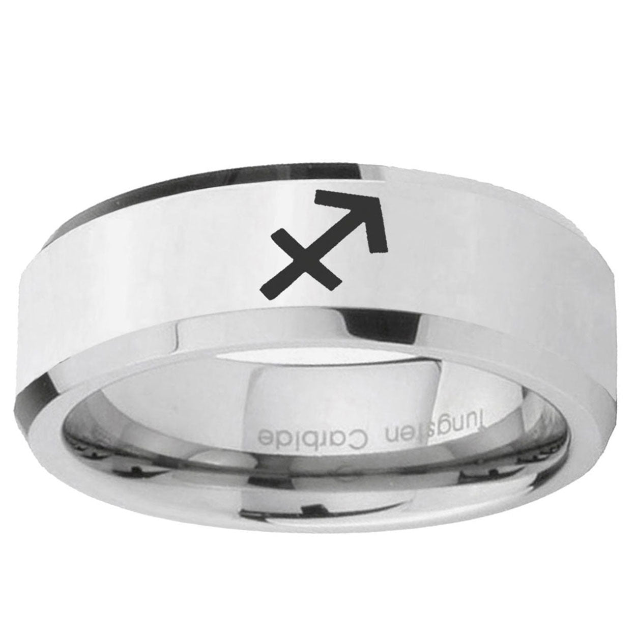 Intruding 5, 8mm Sagittarius Zodiac Beveled Edges Silver Tungsten Carbide Wedding Bands Ring . Offer in both 5mm and 8mm band width polished silver finished from size 4 to 14