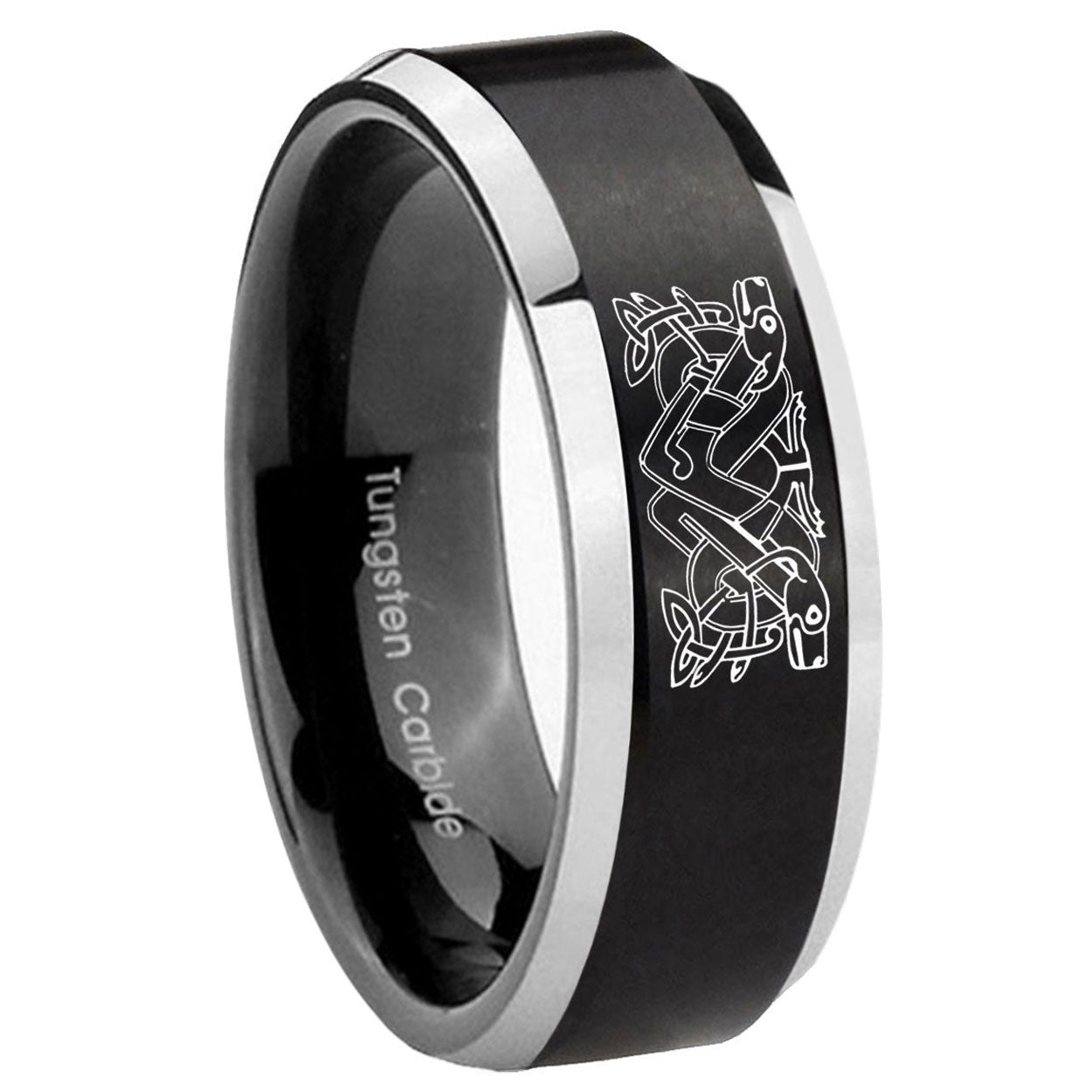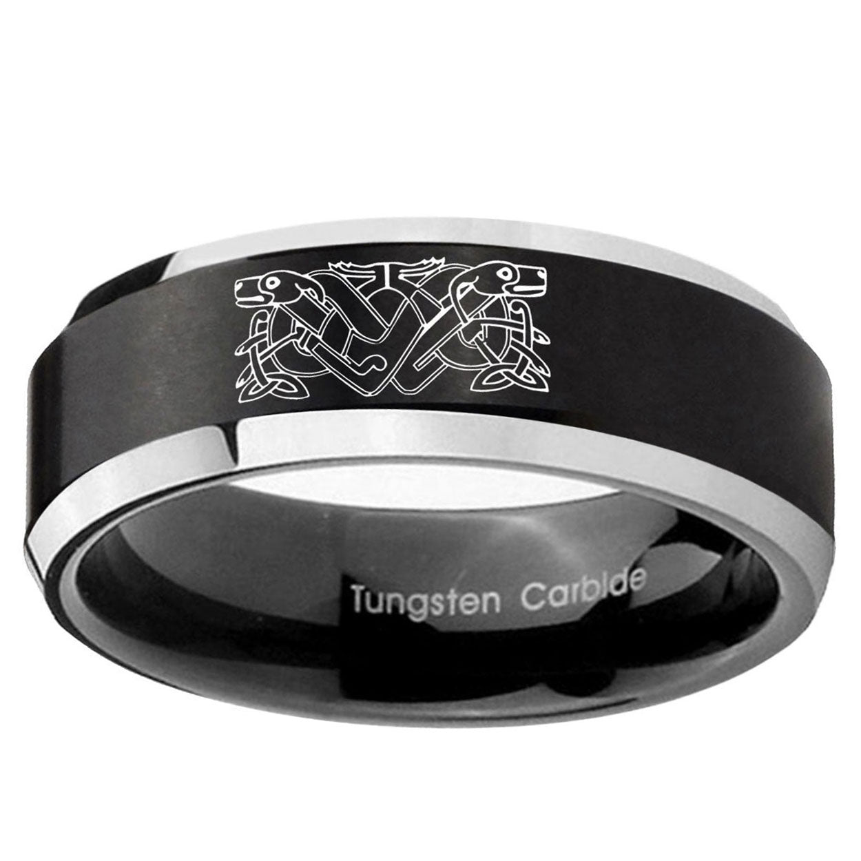 10mm Celtic Dog Beveled Brush Black 2 Tone Tungsten Mens Ring Engraved