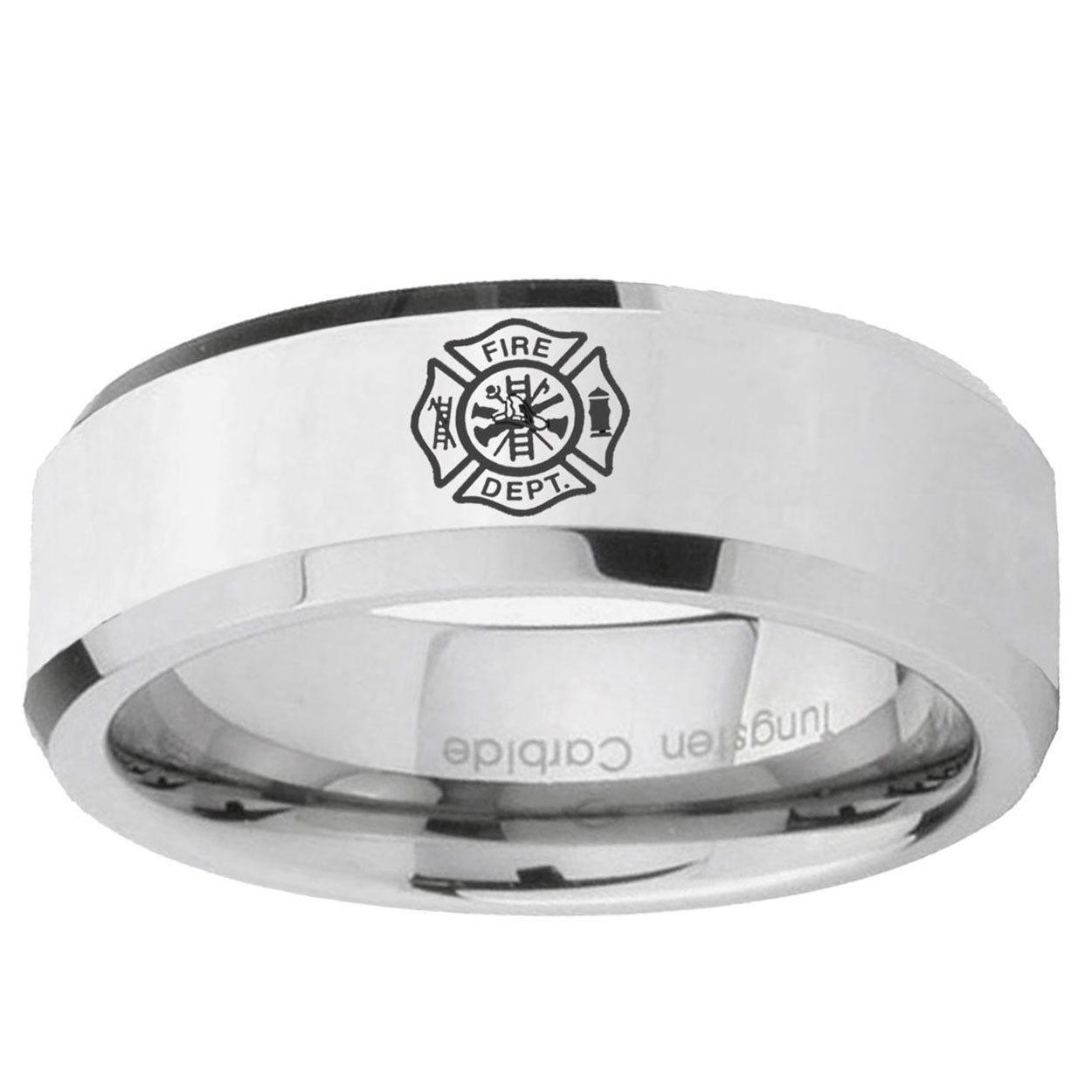 Customize the 10mm Fire Department Beveled Edges Silver Tungsten Carbide Custom Ring for Men. This silver tungsten ring with Fire Department design is perfect for personalization.
