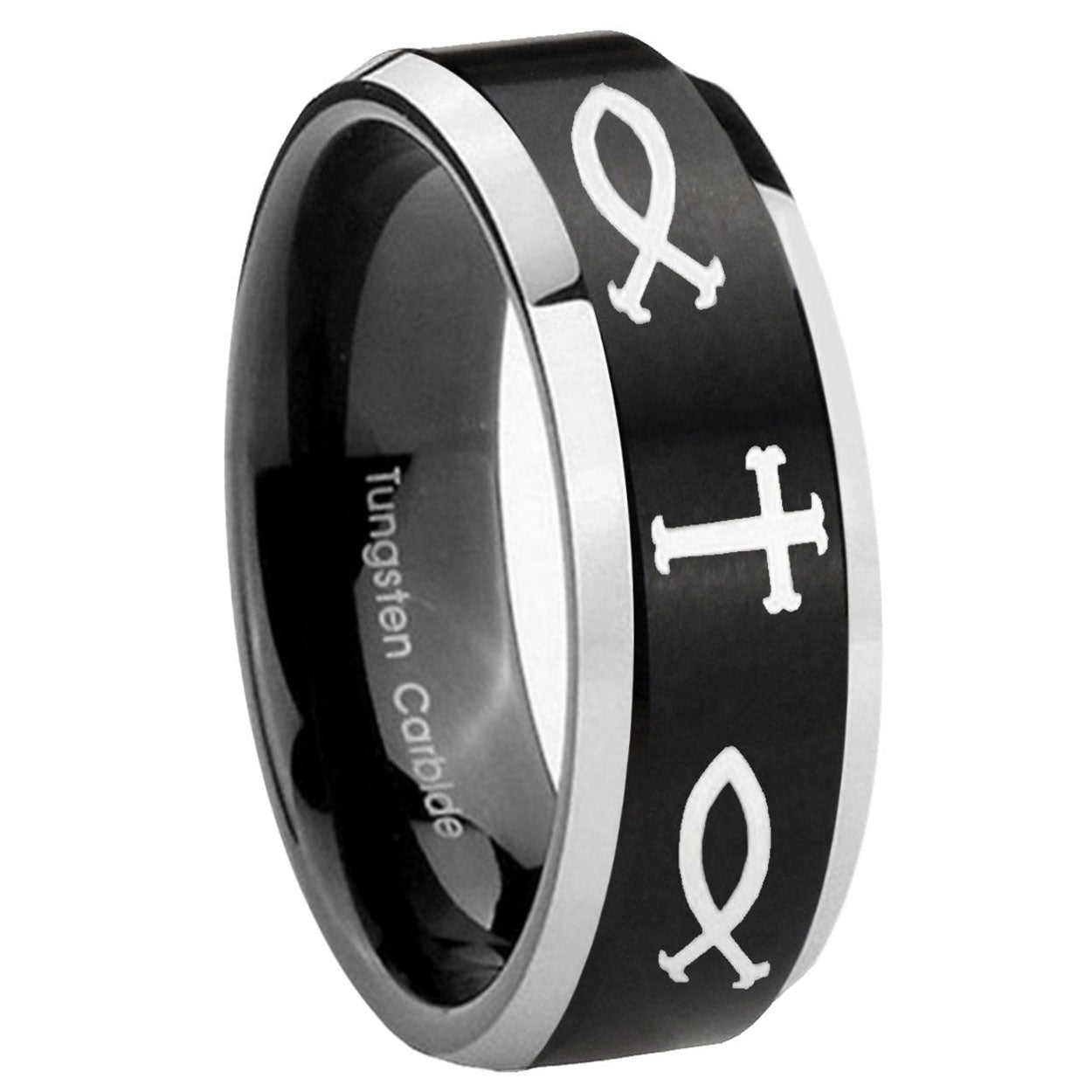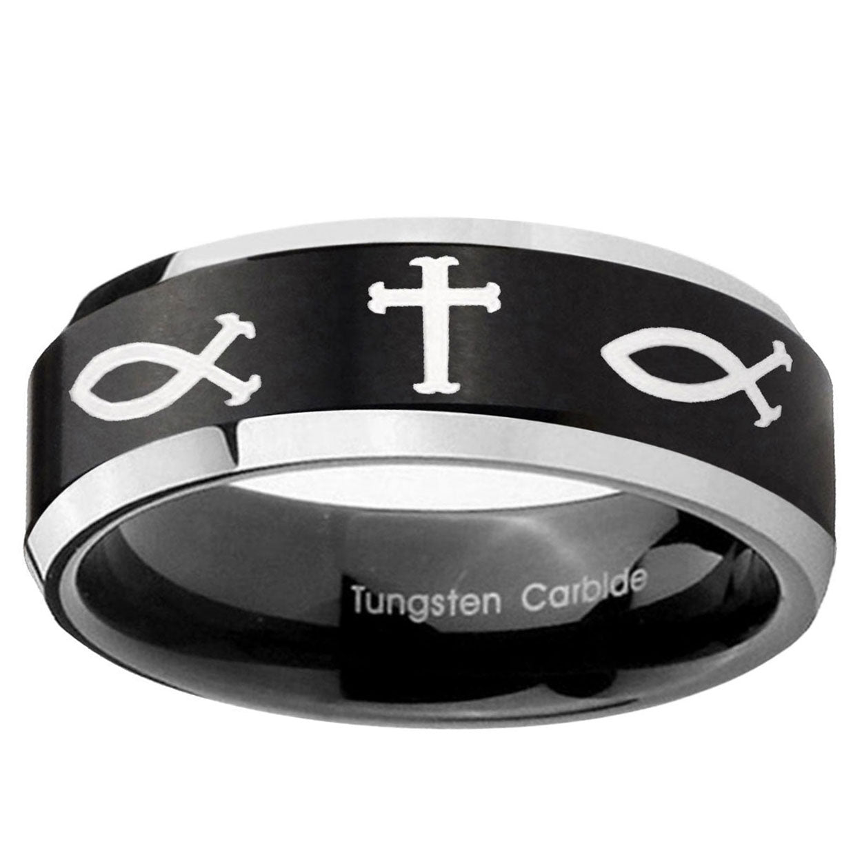 Propose with the 10mm Fish & Cross Beveled Edges Brush Black 2 Tone Tungsten Engagement Ring. This brushed black and 2-tone tungsten ring with Fish & Cross design is ideal for engagements.
