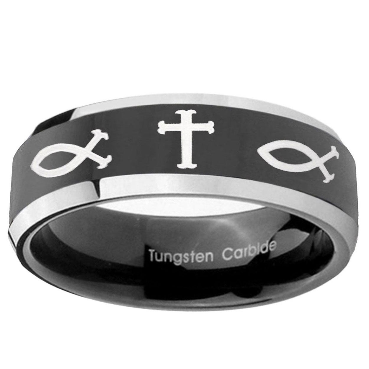 Celebrate with the 10mm Fish & Cross Beveled Edges Glossy Black 2 Tone Tungsten Mens Wedding Ring. This glossy black and 2-tone tungsten ring with Fish & Cross design is perfect for weddings.