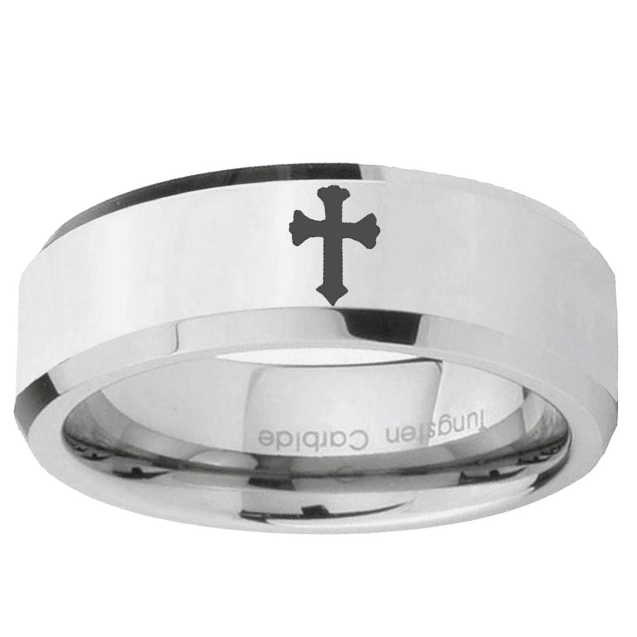 Propose with the 10mm Flat Christian Cross Beveled Edges Silver Tungsten Men's Engagement Band. This silver tungsten ring with Flat Christian Cross design is ideal for engagements.