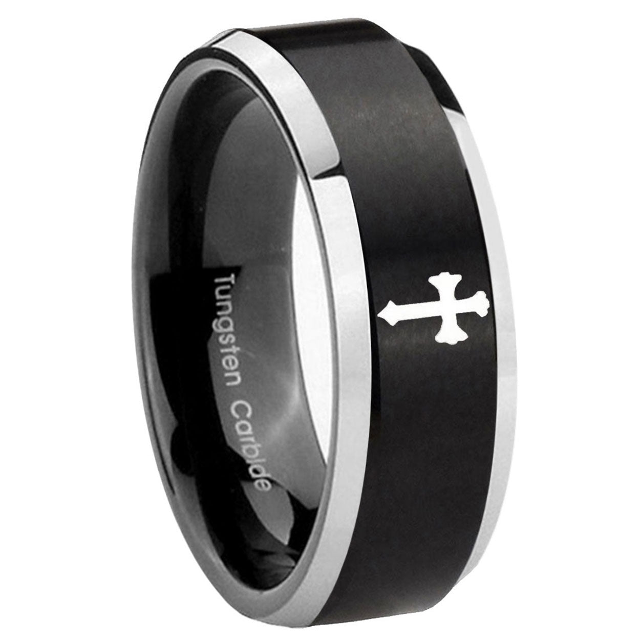 Intruding 5, 8mm Flat Christian Cross Beveled Edges Brush Black 2 Tone Tungsten Men's Ring . Offer in both 5mm and 8mm band width brushed black plated 2 tone finished from size 4 to 14