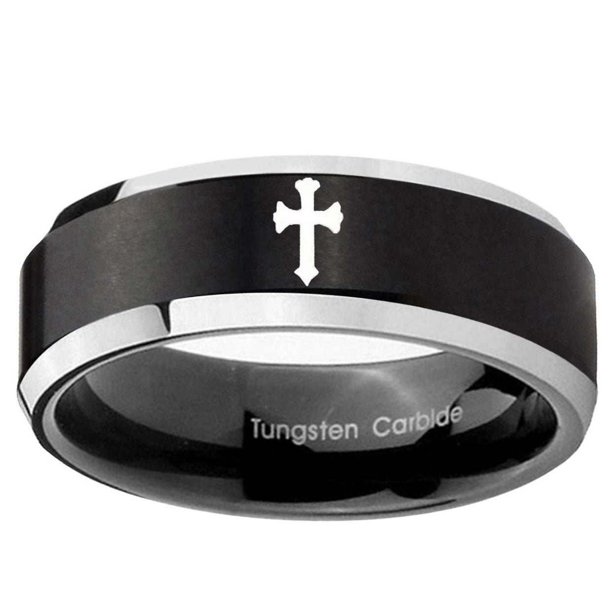 5, 8mm Flat Christian Cross Beveled Edges Brush Black 2 Tone Tungsten Men's Ring