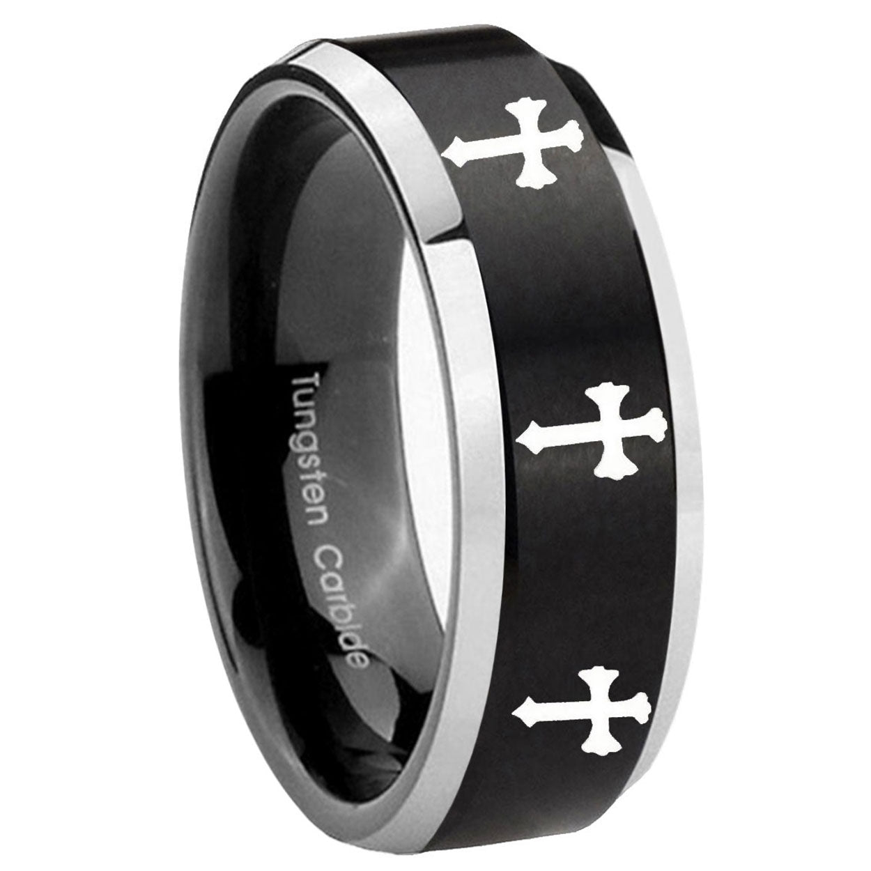 Celebrate with the 10mm Multiple Christian Cross Beveled Brush Black 2 Tone Tungsten Bands Ring. This brushed black and 2-tone tungsten ring with Multiple Christian Cross design is perfect for weddings.