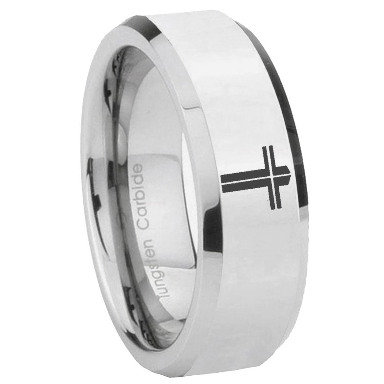 10mm Flat Christian Cross Beveled Edges Silver Tungsten Wedding Engagement Ring