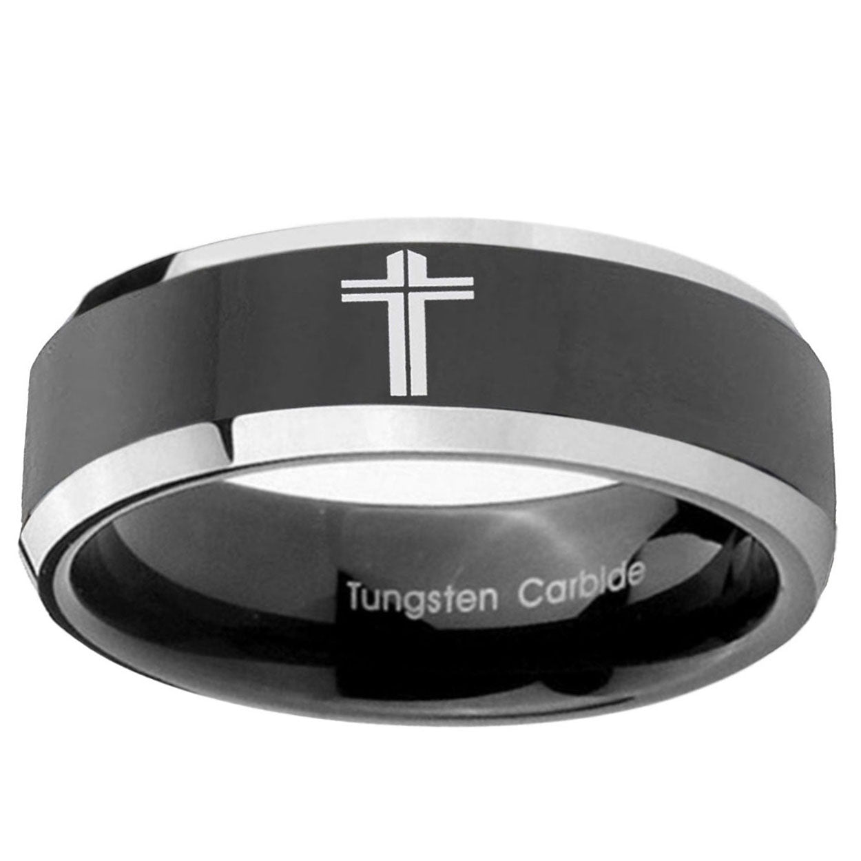 5, 8mm Flat Christian Cross Beveled Glossy Black 2 Tone Tungsten Custom Mens Ring
