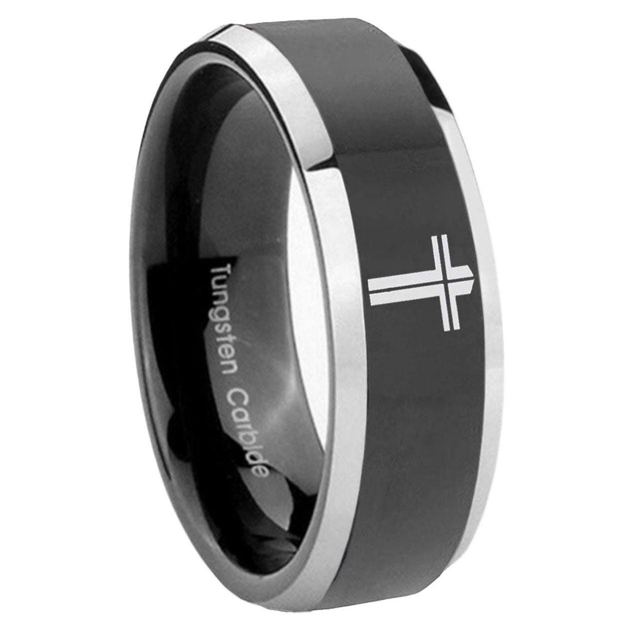 10mm Flat Christian Cross Beveled Glossy Black 2 Tone Tungsten Engagement Ring