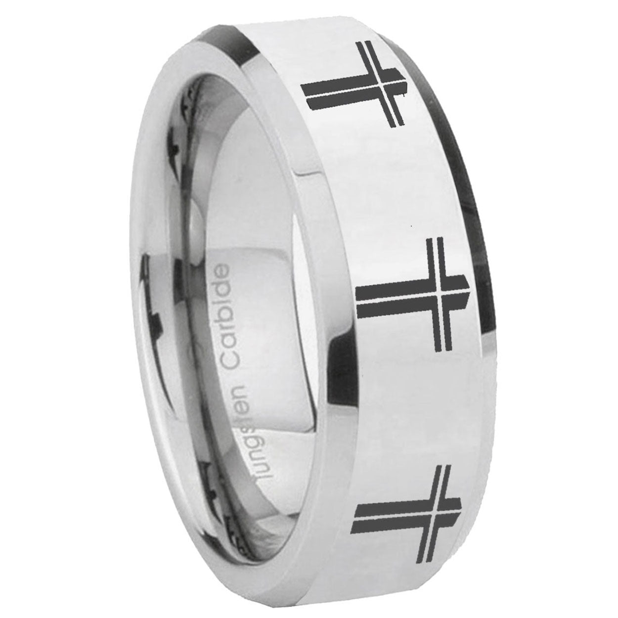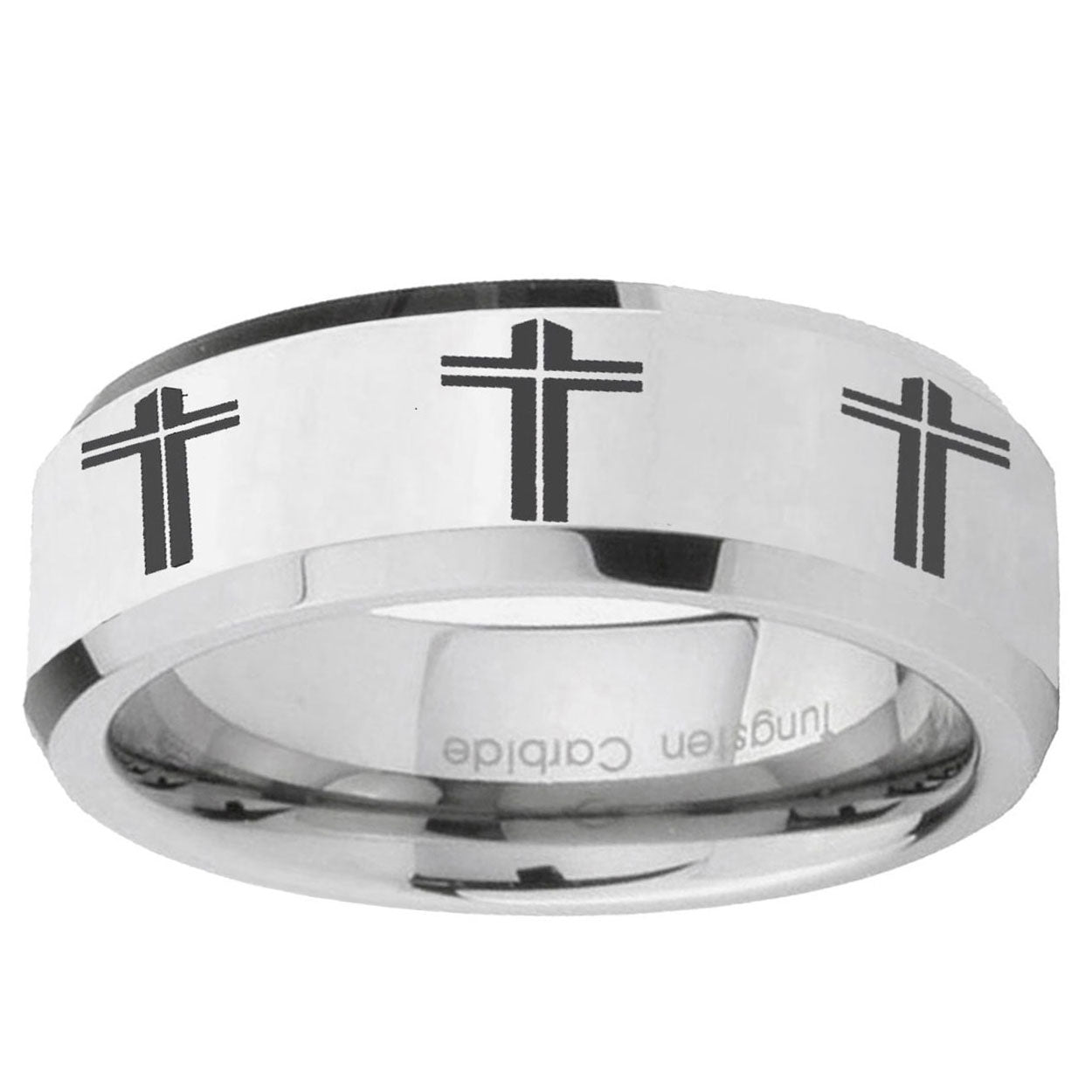 10mm Multiple Christian Cross Beveled Edges Silver Tungsten Engagement Ring