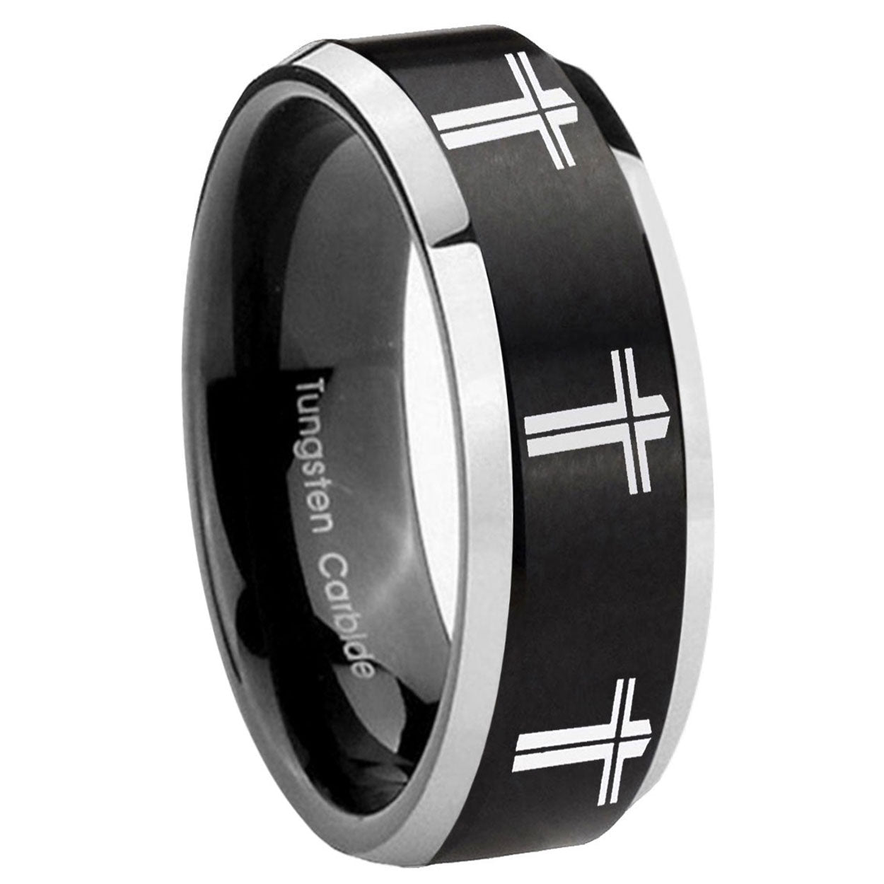 10mm Multiple Christian Cross Beveled Brush Black 2 Tone Tungsten Men's Ring