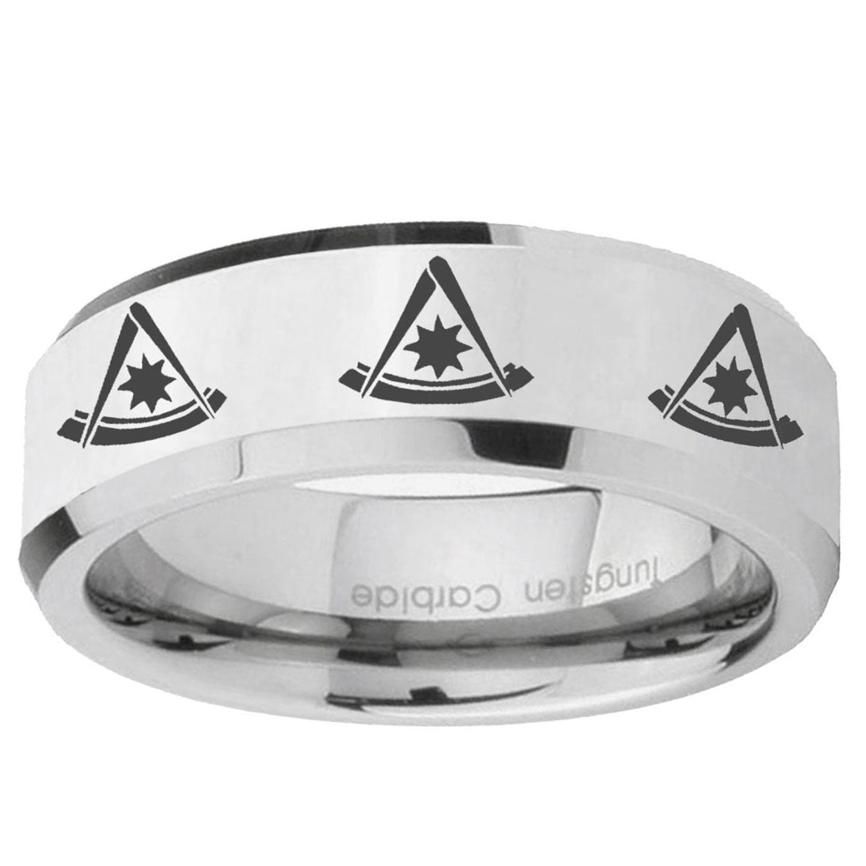 Intruding 5, 8mm Multiple Pester Master Masonic Beveled Edges Silver Tungsten Promise Ring . Offer in both 5mm and 8mm band width polished silver finished from size 4 to 14
