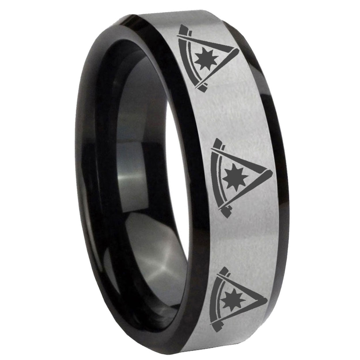 Intruding 5, 8mm Multiple Pester Master Masonic Beveled Brush Black 2 Tone Tungsten Mens Ring . Offer in both 5mm and 8mm band width brush black 2 tone finished from size 4 to 14