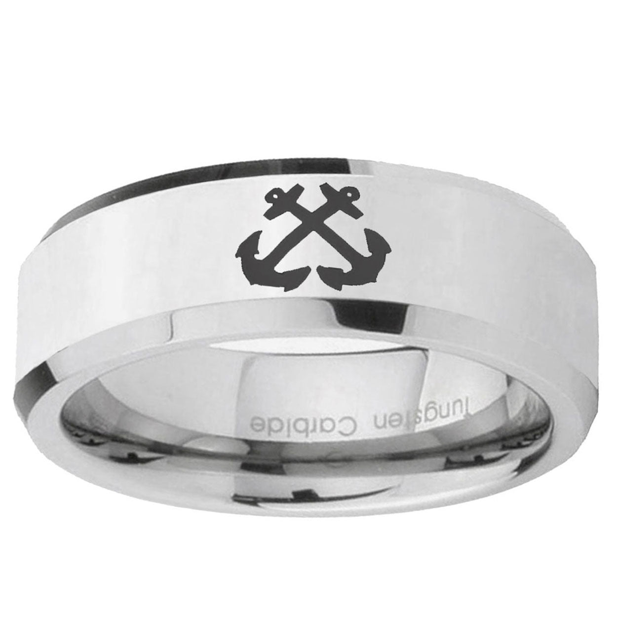 Intruding 5, 8mm Anchor Beveled Edges Silver Tungsten Carbide Engagement Ring . Offer in both 5mm and 8mm band width polished silver finished from size 4 to 14