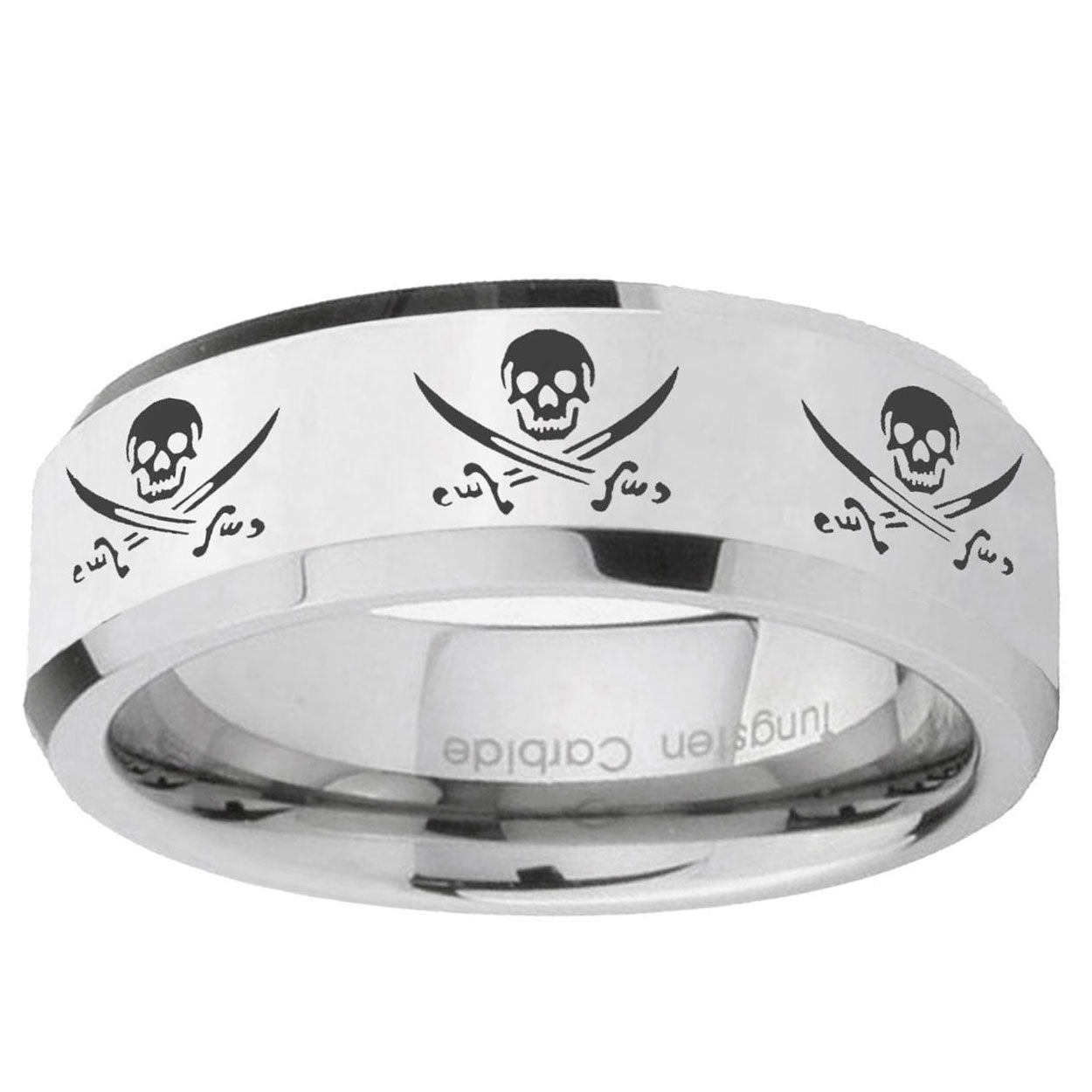 Personalize the 10mm Multiple Skull Pirate Beveled Edges Silver Tungsten Carbide Engraved Ring. This silver tungsten ring with Multiple Skull Pirate design is perfect for custom engravings.