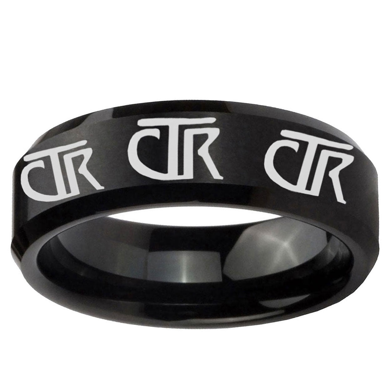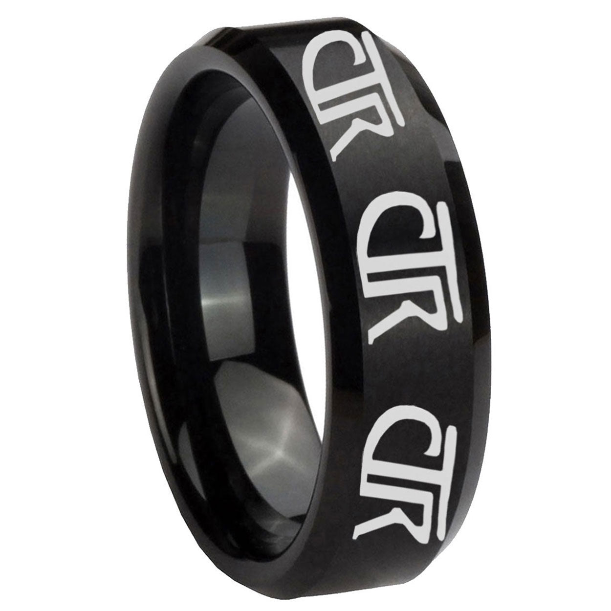 Intruding 5, 8mm Multiple CTR Beveled Edges Brush Black Tungsten Mens Anniversary Ring . Offer in both 5mm and 8mm band width brushed black plated finished from size 4 to 14