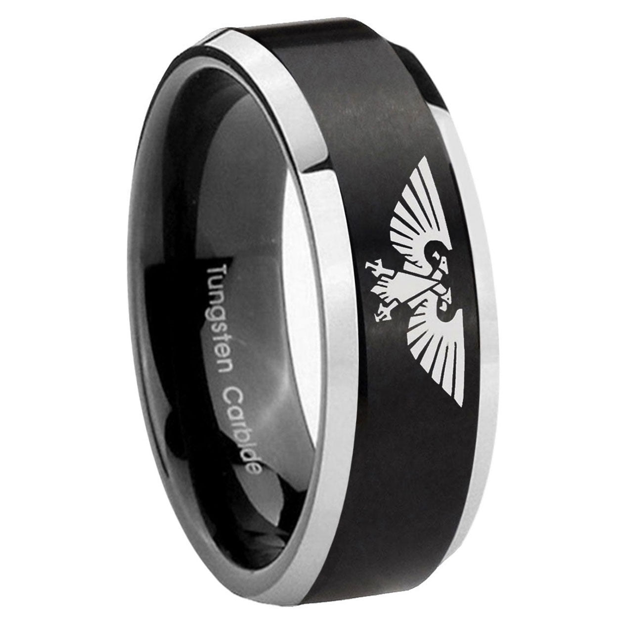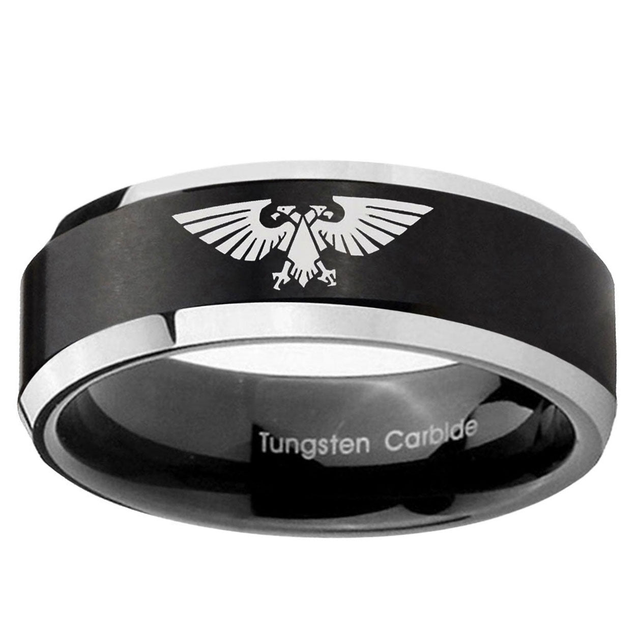 Intruding 5, 8mm Aquila Beveled Edges Brush Black 2 Tone Tungsten Carbide Men's Wedding Band . Offer in both 5mm and 8mm band width brushed black plated 2 tone finished from size 4 to 14