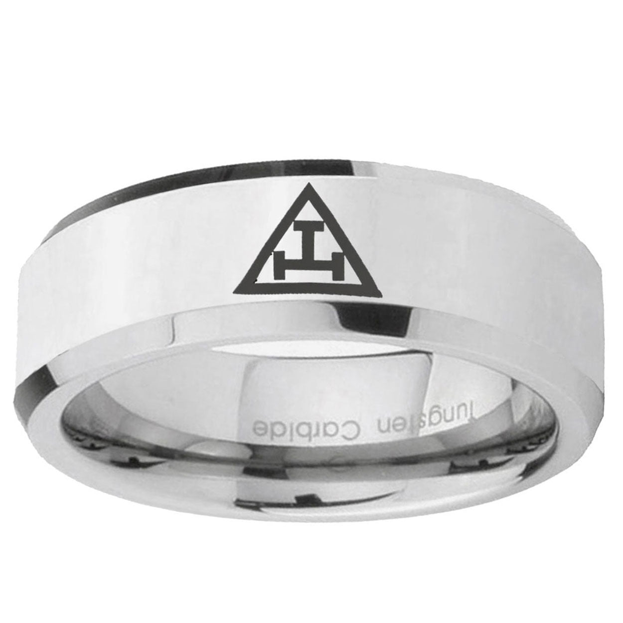 Celebrate with the 10mm Masonic Triple Beveled Edges Silver Tungsten Carbide Wedding Bands Ring. This silver tungsten ring with Masonic Triple design is perfect for weddings.