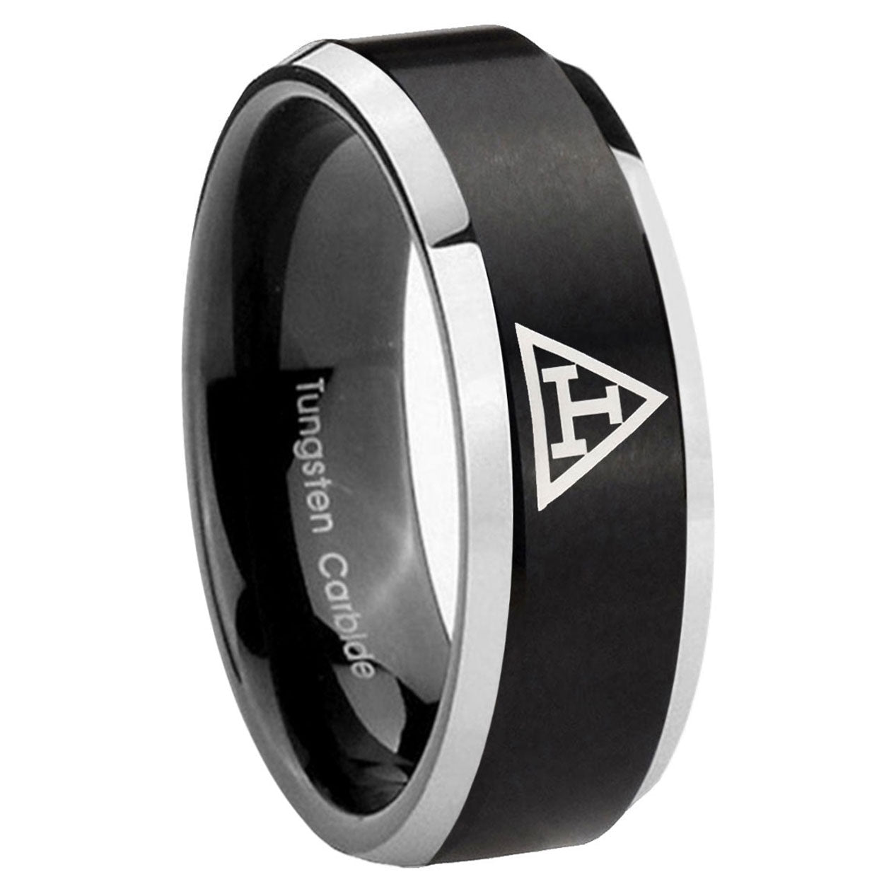Style the 10mm Masonic Triple Beveled Edges Brush Black 2 Tone Tungsten Men's Ring. This brushed black and 2-tone tungsten ring with Masonic Triple design is perfect for men.