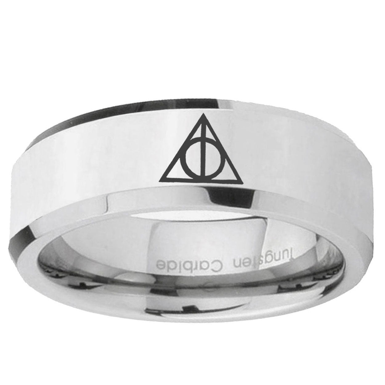 Intruding 5, 8mm Deathly Hallows Beveled Edges Silver Tungsten Carbide Wedding Band Mens . Offer in both 5mm and 8mm band width polished silver finished from size 4 to 14