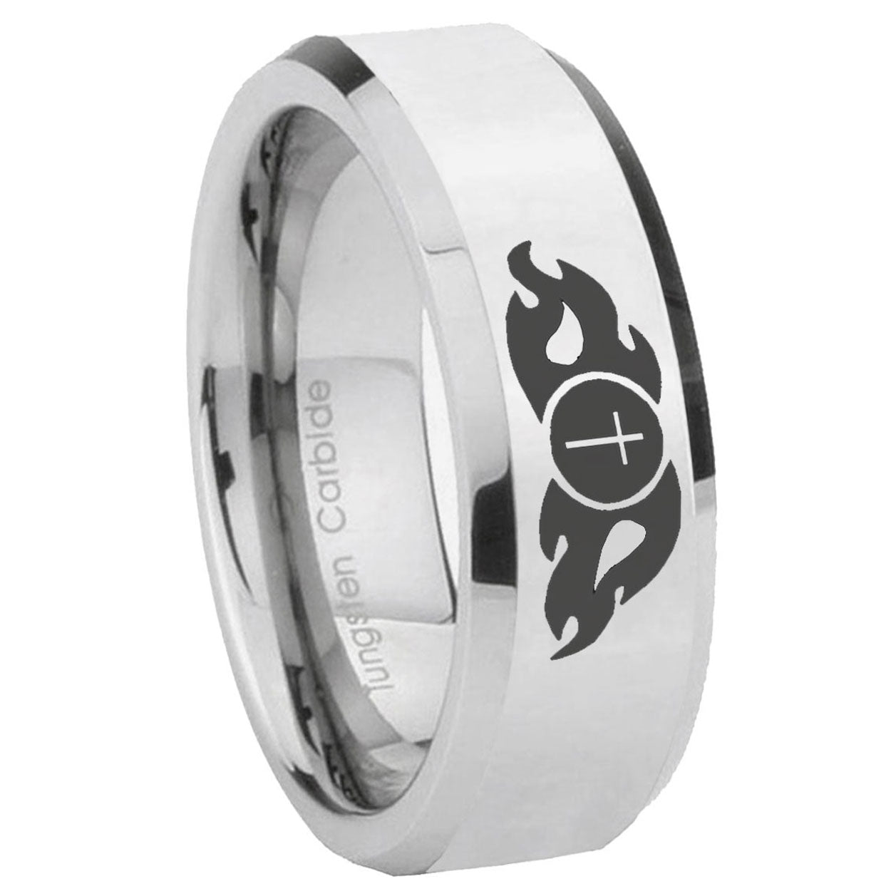 Intruding 5, 8mm Flamed Cross Beveled Edges Silver Tungsten Carbide Custom Ring for Men . Offer in both 5mm and 8mm band width polished silver finished from size 4 to 14
