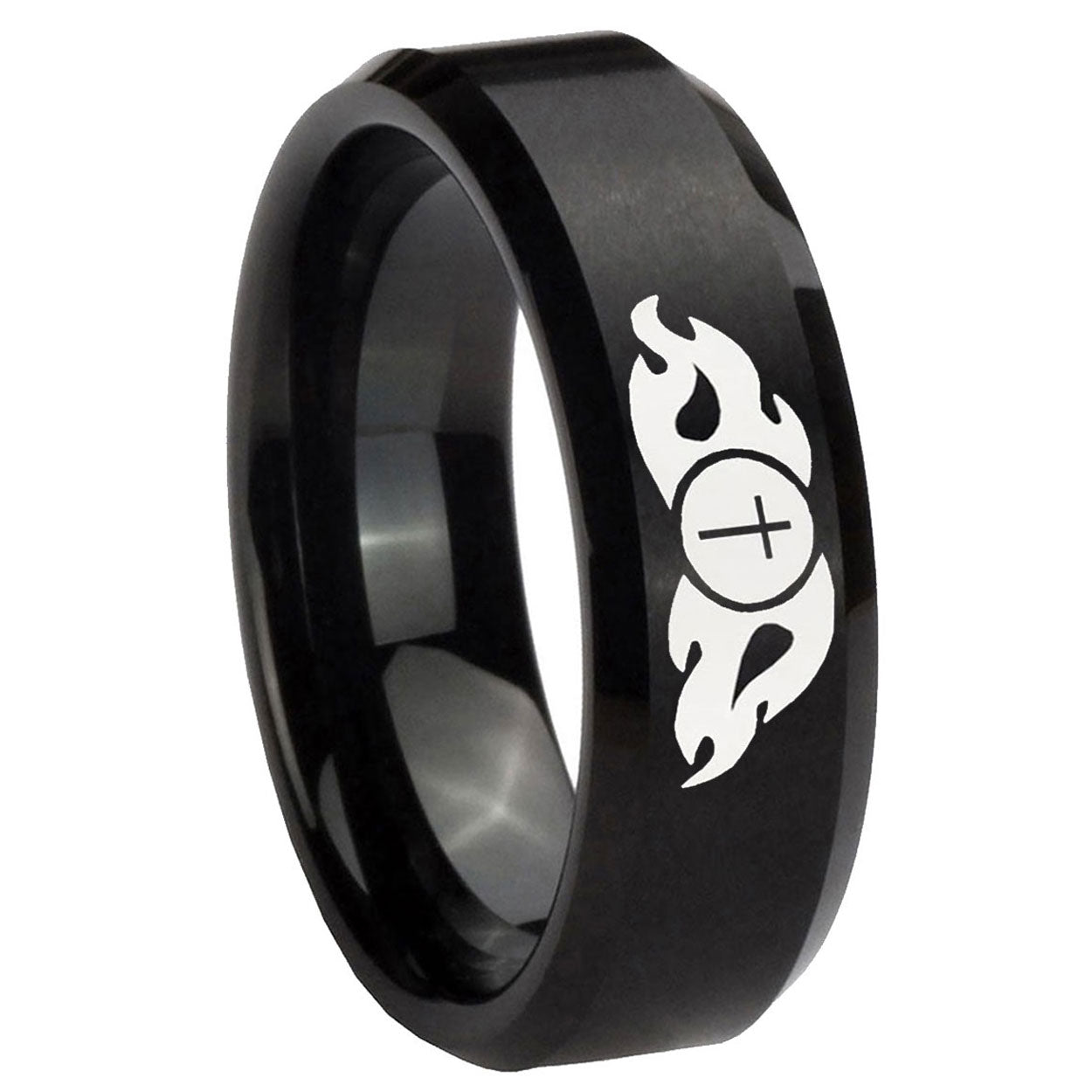 Intruding 5, 8mm Flamed Cross Beveled Edges Brush Black Tungsten Carbide Men's Ring . Offer in both 5mm and 8mm band width brushed black plated finished from size 4 to 14